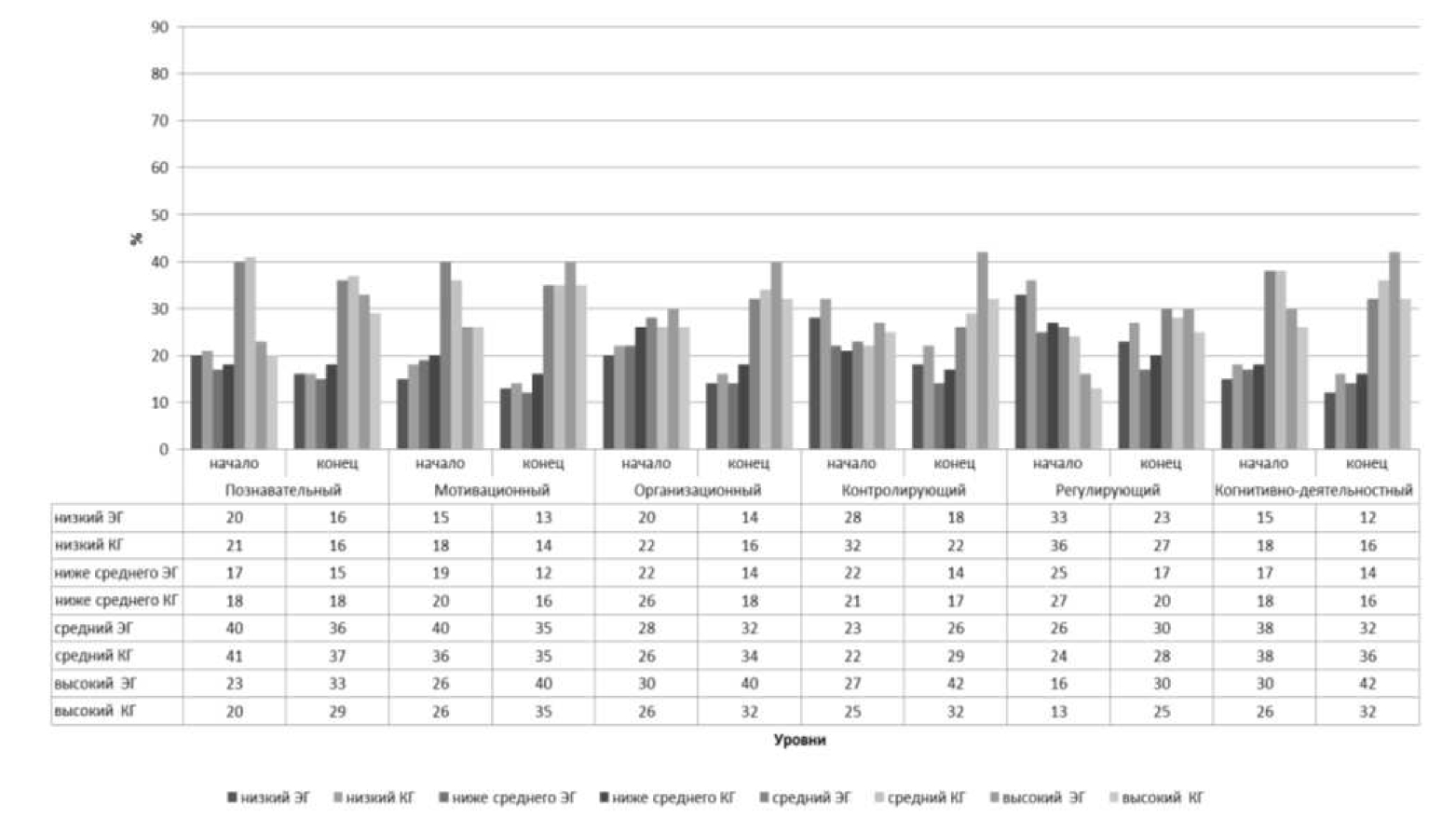 Рис. 1. Промежуточные опытно-экспериментальные данные (сравнение данных на начало и конец второго семестра)
