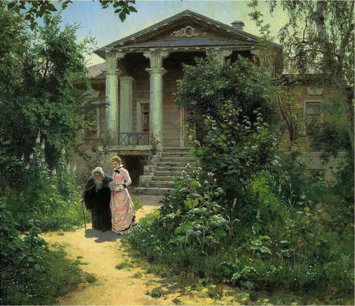 Контекст произведения здесь сложнее, по обрисовке характера персонажей психологичен. Наряду с этим важен аспект уходящей в историю человеческой жизни, а вместе с ней и усадебной культуры. Та же идея отражена в известном произведении В.Д. Поленова «Бабушкин сад» (Рис. 10).