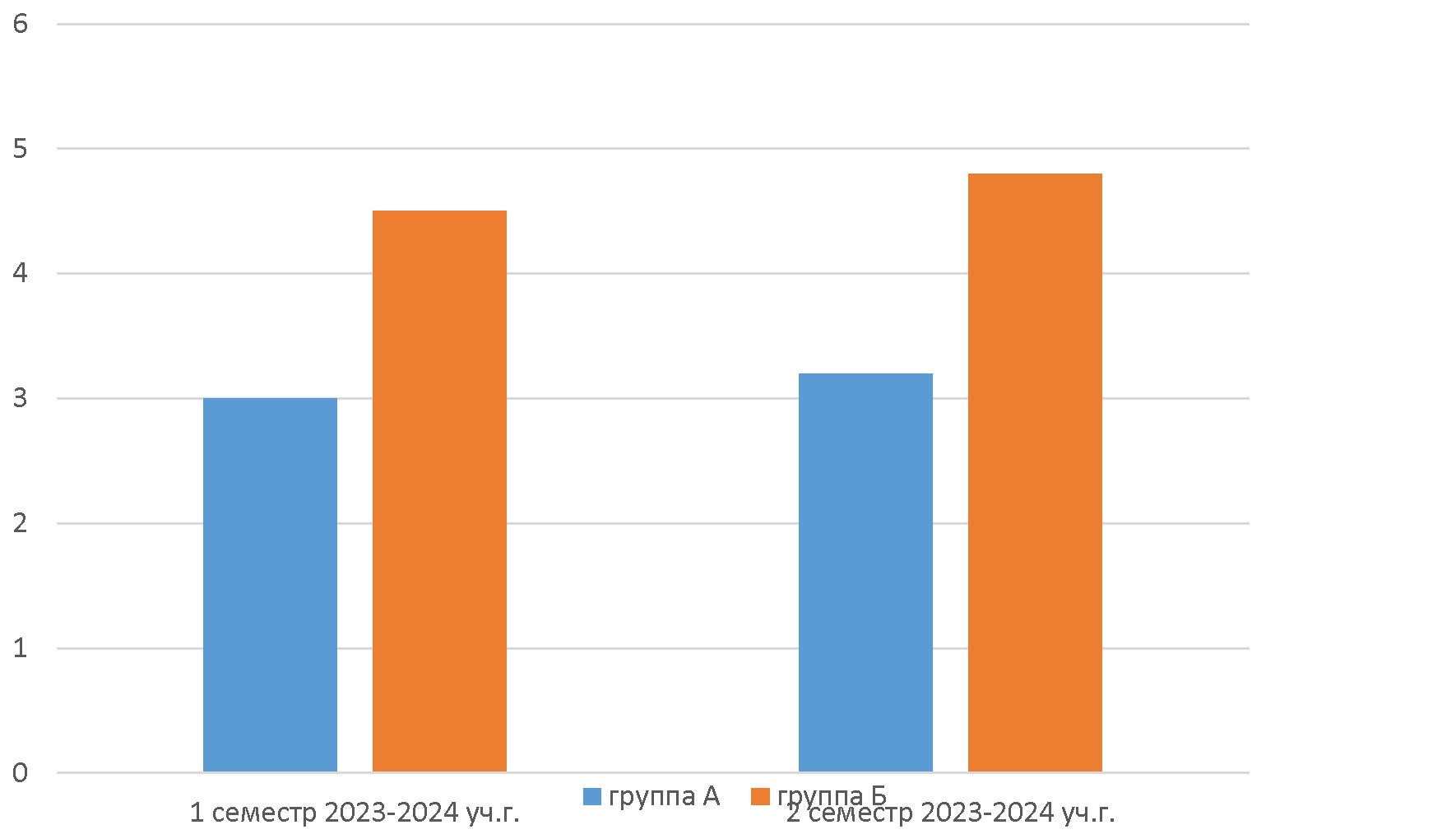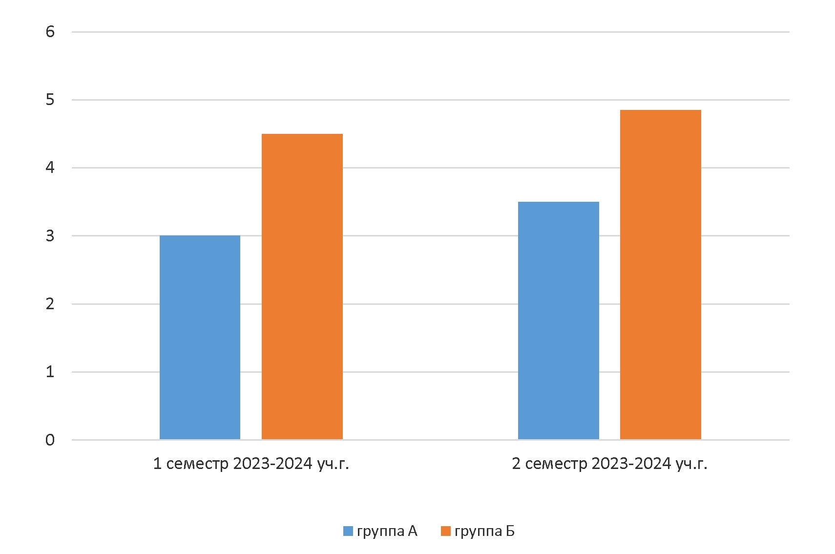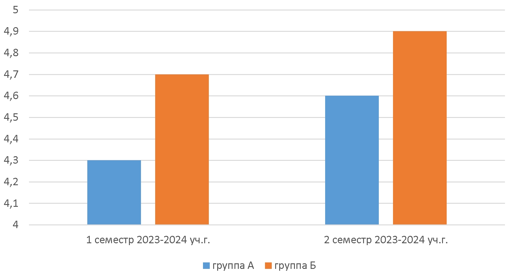 Для реализации технологии проблемного обучения был оптимизирован учебный процесс занятий класса «Ансамбль» студентов группы № 22340 в составе десяти человек. Курс был разделён на две группы: группа А (пять человек) и группа Б (пять человек). В соответствии с рабочей программой дисциплины каждый студент первой группы А получил фиксированный список произведений для освоения от преподавателя. На протяжении первого семестра 2023-2024 учебного года студенты второй группы Б получали задания по самостоятельному выбору произведений заданной педагогом формы. Работа каждого студента основывалась на личных предпочтениях и на понимании им стилевых и жанровых особенностей программы. В процессе работы над нотным материалом студенты фиксировали полученные новые знания, которые обсуждали в своей группе и с преподавателем. В ходе проведения итоговой проверки, контрольного урока по дисциплине «Ансамбль», были выявлены следующие результаты. Студенты второй группы Б успешнее освоили изучаемые произведения, их исполнение отличалось личной заинтересованностью процессом ансамблевой игры, качественной сыгранностью участников коллектива и более высоким уровнем передачи образно-тематического плана, жанровых и стилевых особенностей музыкального материала. Группа А в первом семестре показала более низкий средний результат – оценку «3», за полгода улучшив её только до средней «3,2». В динамике освоения знаний и умений в учебном процессе группа Б показала во втором семестре более успешный оценочный результат по пятибалльной шкале: 4,85 по отношению к 4,5 (Рис. 1). Таким образом, делаем вывод, что реализация технологии проблемного обучения повышает качество исполнительского навыка музыканта и устойчиво фиксирует его заинтересованность в процессе обучения.