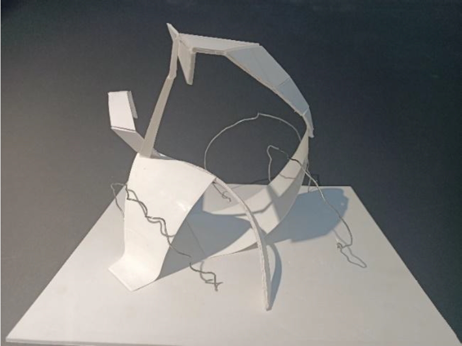 Each line is connected to each other, like neurons in the human mind.” The combination of technological material with high fashion elements of evening wear creates an imagery of a theatrical burst of emotion, a concept of contrasts, which is also reflected in the poster in the image of the model, because ambience and atmosphere covered bubbles of “ironic elements”. The concept or message expressed by image, texture, display of color is different from traditional design where the emphasis is on form, materials, and style. The conceptual approach of the model in the description contains the idea of “samsara – the connection between the past and the future.” Also, there is a paradoxical emphasis – this is the opposition of the decorative texture that envelops the evening dress in a 2-dimensional frame, expressing emotions with plastic, blurring the general direction of the style in pensive melancholy, in the added force fields – a veil of neural materiality, like the object itself – a dress with a non-utilitarian texture.An architectural analogue of incompatible, contrasting materials and textures in the object, the layout uses wire and cardboard (Author Dauletuly Adilet, see Photo No. 2 model). The task was to show the theme of the traditional element of the architecture of the nomadic dwelling kiiz uy – the yurt, and its walls, like a “kerege” lattice enveloping the volume. The model bears the mood of the loss of form and its connections within sphericity in a centric composition that is destroyed – this is a manifesto of irony from the lack of clarity in the understanding of the Big Form in today's aesthetics of Kazakhstan.