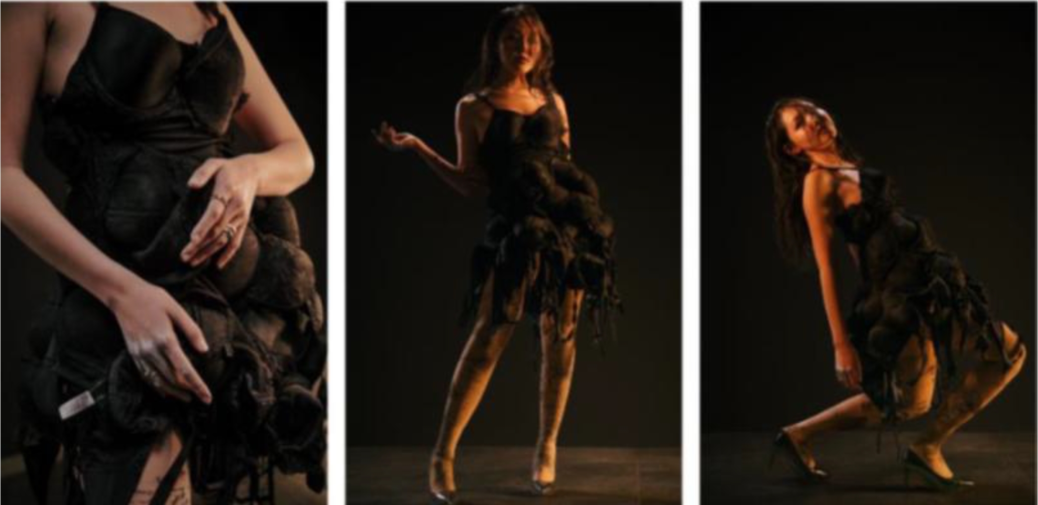 If we consider the same trends in the shells of the costume, then we can point out the presence of ironic details, (see photo No. 3, model. student: Askarova D). Designers can include elements in clothes and accessories that evoke laughter, ironic feelings from unexpected associations: 33 black bras were used. This concept of conscious limitation in techniques fits into the modularity of the search for form. The poster is distinguished by secondary convention and broken lines of the model's body in the presentation, deliberate angularity, and mannequin mannerism – the techniques of conceptual lines or the death of the technique itself – black on a black background, like a dissolving form.