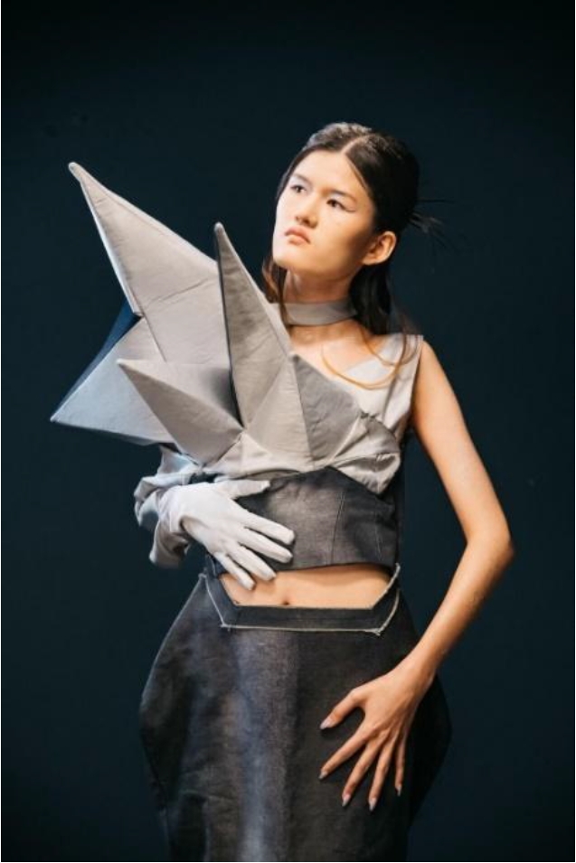 Looking back to the sheath of the costume, the fractals of the crystal image by Ashken D. are described in this way: “... the emphasis in the image is the figures in the form of a pyramid, moving from the chest to the left shoulder. They are made of satin fabric glued to a felt base; in contrast, a relief glove is worn on the left hand. A modular method was used". This is an example of an intellectual search for a form, building architectural forms outside of human volume and gravity, which puts the model in conflict with established traditions. This is a process of the primacy of form and emptiness, for which there are no units of measurement, because it is a state of static omnipresence where there is no time. To complete the process of finding a form, boundaries are needed, and conceptually connect each point of the end and beginning of the first form, which presupposes the architecture of matter on the scale of the Universe, therefore the geometry of the polyhedron appears, like a diagram of the form. The creation of the first man, his bodily reflection, is a shell, as an ideal balance of the bodily and abstract, which served to create the philosophical abstraction of form. The image takes away from the anthropomorphic properties of the suit and endows it with the properties of an abstract design-object with the aim of in-depth study of one specific de of it - shaping outside the rules. Exploration of silhouettes and proportions. Deconstructionist designers break conventional expectations in silhouettes and proportions, creating contrasting, heavy shapes, and contrasts, eliminating the image of gravity in forms, also in clothing, and in the shell of buildings. Deconstructivism also involves playing with materials and textures such as glass, metal, concrete and composites to create unique and complex surfaces. This may include experimenting with volume, strange lines, and unexpected details (see photo No. 7 S. Nurasyl).