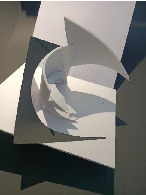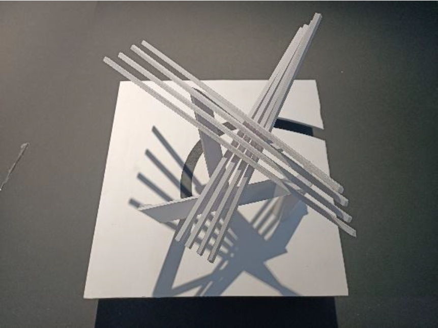 Architectural experiments were carried out in the model, (see photo No. 8 Dauletuly A. model of yurt, Photo No. 9 Dauletuly A. model of shanyrak): deconstruction in experiments mechanically breaks the shape of an object into its component parts, revealing how such a composition in a new state works.
