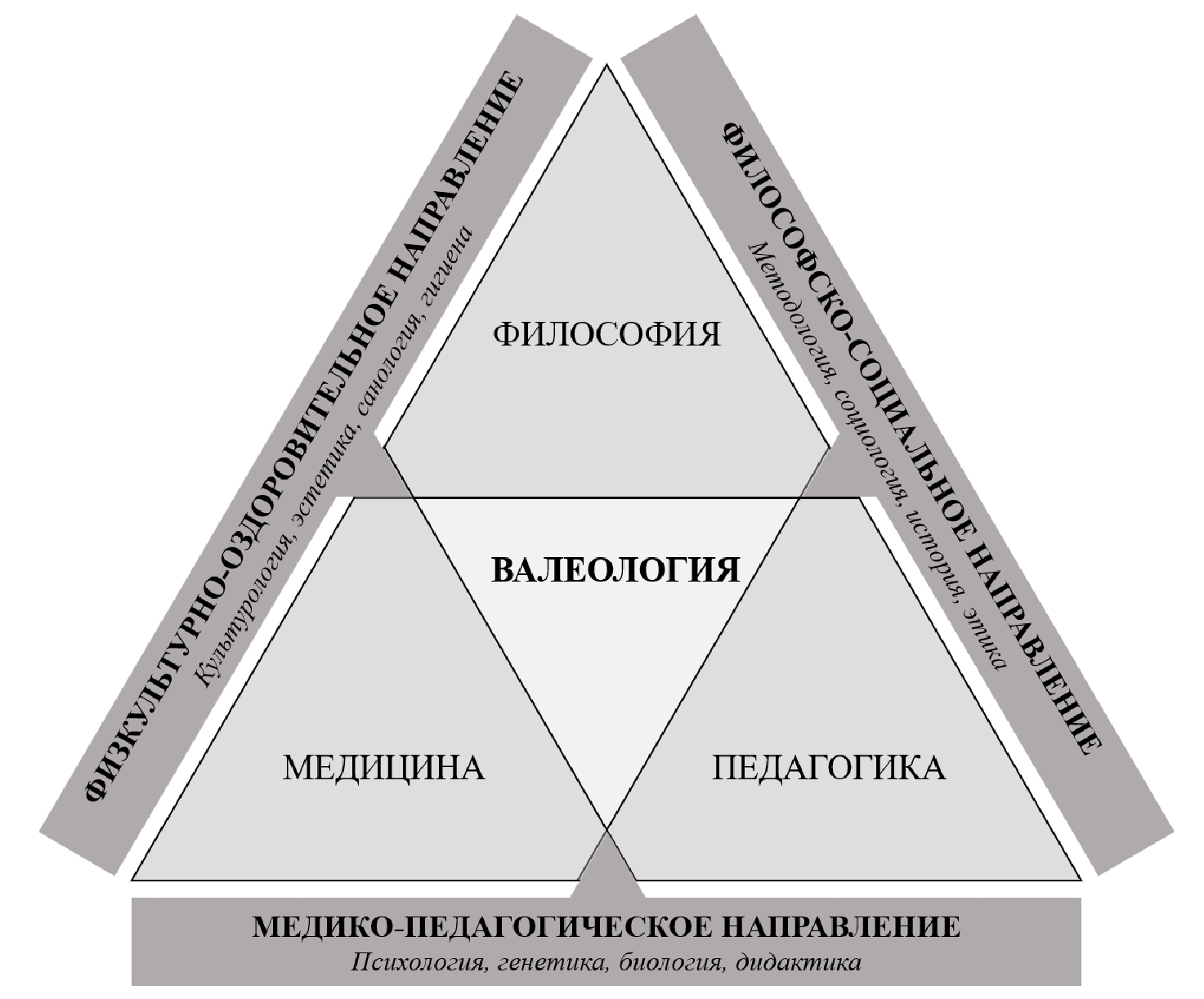 Однако занимая центральное положение, валеология не ограничивает круг интересов людей только индивидуальным здоровьем. Национальное здоровье – один из ключевых предметов синологии, а общественное здоровье является предметом социологии. Не упускается из вида и генетический аспект, а также влияние на здоровье социально-педагогических факторов. Поэтому на стыках базовых наук валеология объединяет знания множества смежных научных течений, которые можно обозначить как три направления (рис. 1).
