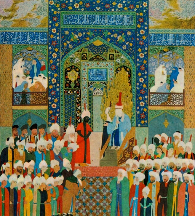 Рис. 2. «Последняя проповедь Пророка Мухаммеда». «Ахсан ал-Кибар» Мухаммада ал-Хусайни ал-Вирамини. («Лучшие из великих людей. Предания о жизни праведных имамов»). Предположительно Касим Али. 1526 г. Российская национальная библиотека, Санкт-Петербург. Dorn 312, 313.