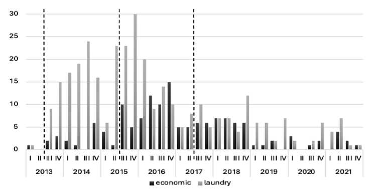 Далее каждому факту дефолта (отзыву лицензии в большинстве случаев или мерам по оздоровлению, таким как ввод временной администрации) была присвоена причина на основе анализа публикуемого ЦБ РФ пресс-релиза и открытых новостных данных (сайт banki.ru, Ведомости, Коммерсант, РБК и т.д.)[7]. Такой подход позволяет более точно оценить причины, поскольку в пресс-релизах, как правило, указаны довольно общие формулировки, а обстоятельства мошеннического характера раскрываются позднее и придаются гласности при помощи СМИ. На основе проведенного анализа было выделено две наиболее распространенные причины дефолта – экономические проблемы (неэффективность, высоко рискованная бизнес-модель, ошибки в управлении, нарушение нормативов достаточности капитала и т.д.) и нарушение законодательства о противодействии легализации (отмыванию) доходов (случаи мошенничества, отмывания средств, обналичивания, проведение сомнительных транзитных операций, наличие забалансовых вкладов, фальсификация отчетности, а также неоднократное применение в течение года различных мер со стороны регулятора: штрафы, предписания, запреты на проведение отдельных операций). Для краткости далее будем называть эти причины экономическая несостоятельность (economic) и отмывание (laundry).