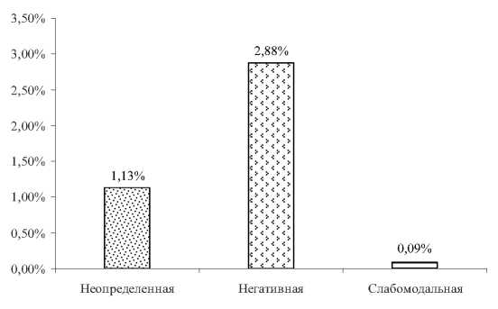 Наибольший процент неопределенных слов содержится в главе «Use of Proceeds», а негативных слов – в главе «Risk Factors» (табл. 1). Во всех разделах, кроме «Risk Factors», наблюдается невысокий процент употребления слабомодальных слов.