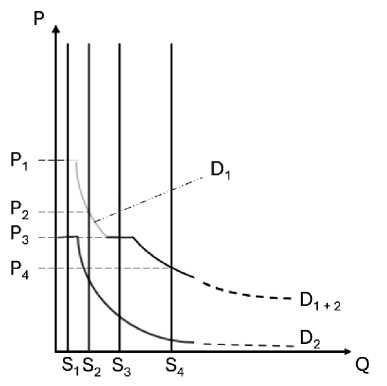 We have two groups of traders whose payoff predictions, and therefore , are different. Because neither group of traders would buy the risky asset above its estimate of the payoff, the demand functions D1 and D2 both have a sharp cutoff at the top. Below the highest estimate of the payoff (in this case corresponding to P1) three cases are possible.