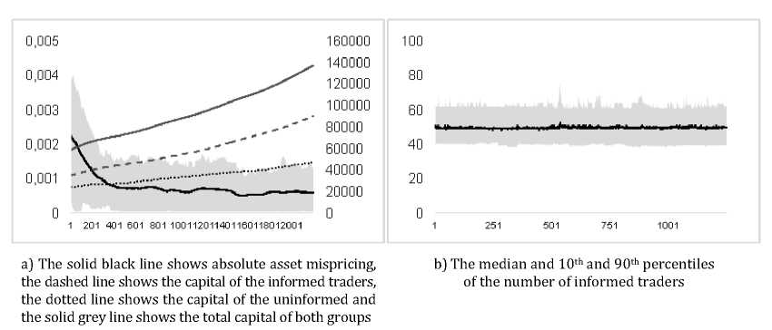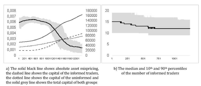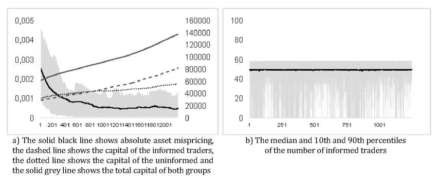 Fig. 2b-11b show the median number of informed traders across simulation runs (solid line) as well as the 10th and 90th percentiles of this number shown in light grey margins around the line. We report these data for the last 1300 periods of simulation runs, as the numbers of informed traders converge to stable values only after this cutoff.