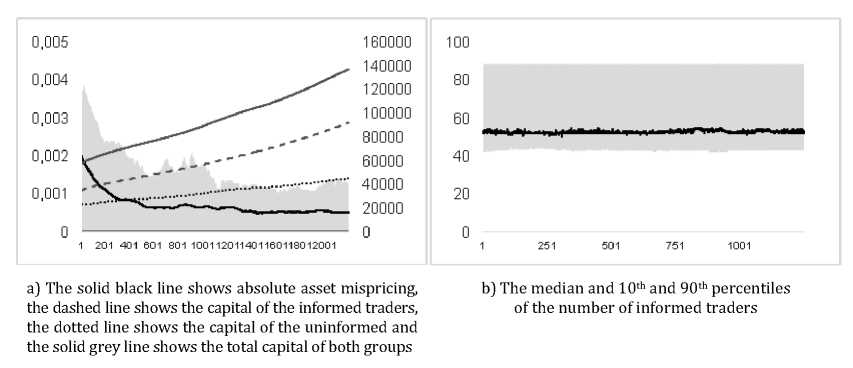 However, our main and most surprising finding emerges when one compares Fig. 2a and 3a, showing the results for the information costs 0$ and 0.02$, respectively. We can observe that when the cost of information transitions from a positive value to zero, the capital accumulation by the informed traders in the first half of the simulation is actually slower than that of the uninformed ones. Eventually the informed traders manage to overtake the uninformed ones in terms of accumulated wealth, but paradoxically, this happens much later compared to the case where the cost of information is slightly positive (Fig. 3a–6a). This finding is further strengthened by Fig. 2b and 3b which show the numbers of the informed traders. The 10th percentile of informed traders is actually lower for the case with the information cost of 0$ than for the cases with C = [0.02, 0.08]. In fact, for the slightly positive information costs, the number of the informed traders is never zero at the 10th percentile level. The relative wealth dynamics of the informed and uninformed traders find their reflection in the mispricing dynamics, with the mispricing being higher (at least in the initial periods) for the information cost of 0$ than 0.02$.