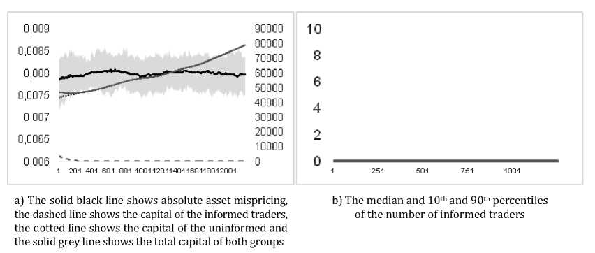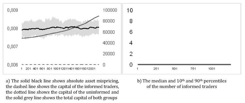 These findings suggest that there is an “equilibrium” level of information cost, somewhere between 2$ and 4$ in our case, for which both the informed and the uninformed traders have the same level of fitness, such that neither of the two strategies drives the other out of the market.