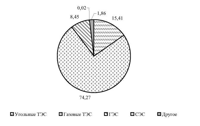 Узбекистан, как и Туркменистан богат газовыми месторождениями, во многом данное обстоятельство способствовало превалированию наличия газовых ТЭС в структуре выработки электроэнергии Узбекистана – 74,27%. На долю угольных ТЭС в Узбекистане приходится 15,41%, 8,45% на ГЭС и 1,88% на остальные виды (рис. 2).