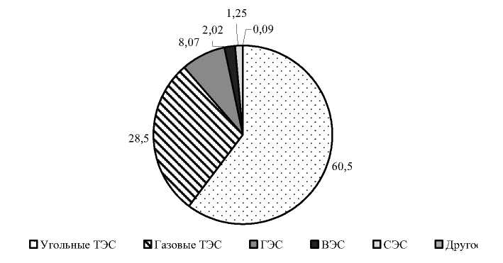Среди всех республик Центральной Азии самая «грязная» структура выработки электроэнергии у Казахстана. 60,05% приходится на угольные ТЭС, 28,52% на газовые ТЭС, 8,07% на ГЭС, 2,02% на ВЭС и 1,25% на СЭС (рис. 3). Порядка 88% выбросов СО2 приходятся на угольные ТЭС. В то же время Казахстан показывает самый высокий уровень развития ВИЭ и СЭС. В структуре выработки самая высокая доля газовых ТЭС приходится на Туркменистан – 100%.