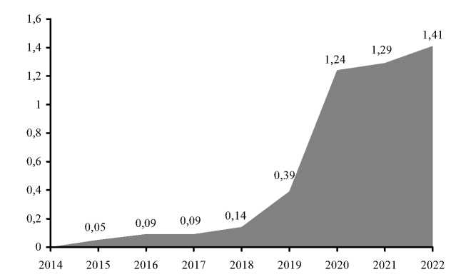 Выработка на СЭС в Казахстане показывает устойчивые темпы роста. Если в 2018 г. уровень выработки составлял 0,14 ТВт/ч, то в 2022 г. этот показатель достиг отметки в 1,41 ТВт/ч (рис. 9).