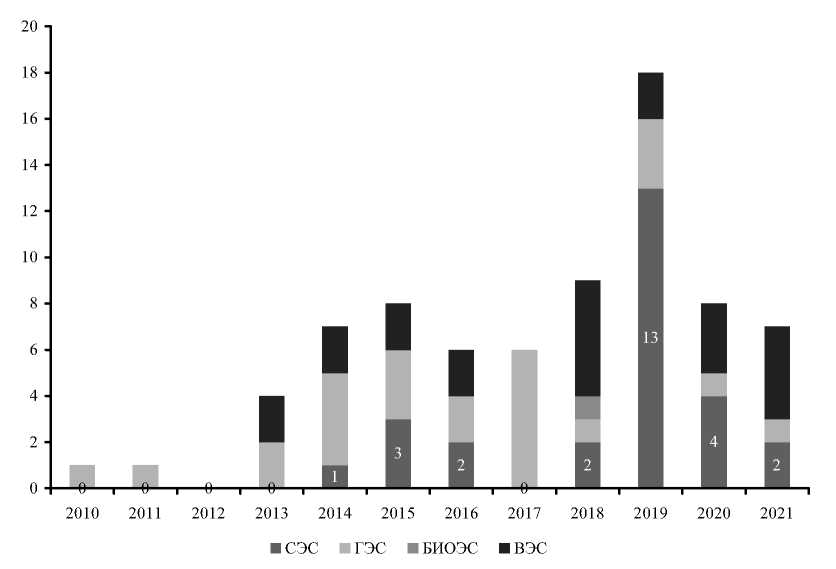 Рис. 10. Количество вводимых станций ВИЭ в Казахстане (2010–2021 гг.)