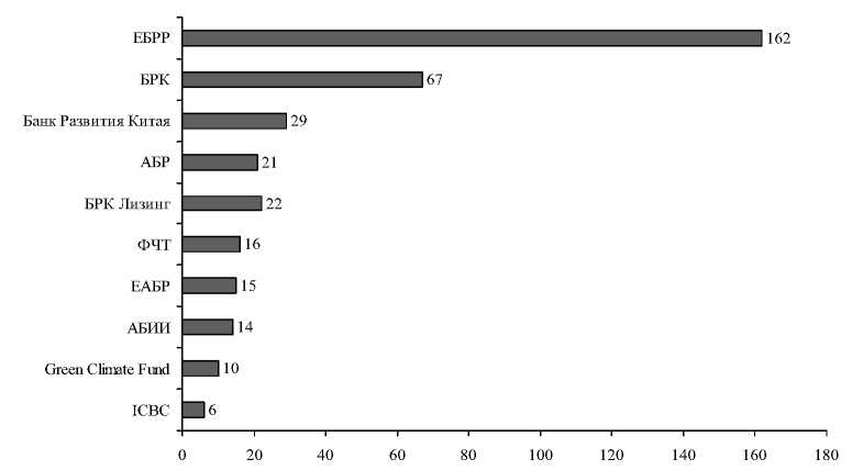 В рамках долгового финансирования больше всего средств было привлечено от ЕБРР – 162 млрд тенге, за ним идут восточные институты развития: Банк Развития Китая и АБР – 29 и 21 млрд тенге соответственно; ЕАБР находится только на седьмом месте – 15 млрд тенге (рис. 11). Стоит отметить, что в рамках привлечения инвестиций значительную долю из привлеченных средств принесли локальные инвесторы – на их долю приходится 63%. Однако их доля падает на 22%, если рассмотреть вопрос привлечения средств с точки зрения структуры общеустановленных мощностей – до 41%, в данном разрезе превалируют иностранные инвесторы: Китай (13%), Германия (11%), СП (Казахстан и Британия – 8%), Италия (8%) и Россия – 6%[29]. Таким образом, иностранные инвесторы в большей части заинтересованы в крупных проектах, в свою очередь локальные инвесторы склонны вкладываться в малые и средние проекты.
