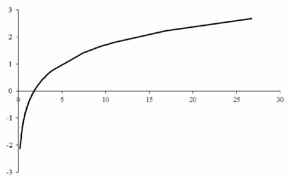 Отметим, что для столичных страховых компаний рост этого показателя также сопряжен с ростом эффективности. Приведем для сравнения соответствующий график FP1-функции. Отметим, что положительное влияние на эффективность данный показатель оказывает, начиная с некоторой величины.