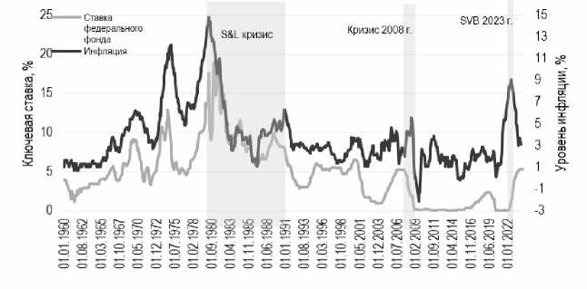The tightening of the Fed's monetary policy as part of the fight with inflation became one of the key factors of the banking crisis of 2023. During this crisis three large banks with a record amount of assets of $ 550 billion went bankrupt. The mechanism of the crisis of 2023 was similar to the crisis of savings and loan associations in the United States in the 1980s and had a classic pattern of development under increasing interest rates. The scale of the banking crisis turned out to be limited due to financial regulation measures introduced in 2009–2019, as well as due to the prompt response of regulators – liquidity support programs and full coverage of depo-sits of bankrupt banks.