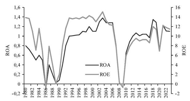 Рис. 3. Рентабельность активов и капитала, в %, 1980–2023 гг. Все учреждения, застрахованные FDIC Источник: составлено авторами на данных FDIC.