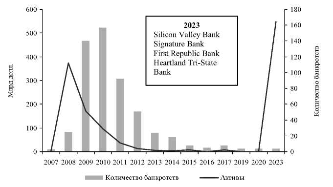 В ходе банковского кризиса в США 2023 г. обанкротились три крупных банка – Silicon Valley Bank, Signature Bank и First Republic Bank. Несмотря на небольшое количество пострадавших банков, по объему активов этот кризис оказался сопоставим с кризисом 2008–2009 гг. – общий объем активов обанкротившихся банков составил почти 550 млрд долл., что в номинальном выражении примерно равно активам банков, обанкротившихся в 2007–2009 гг. (хотя с поправкой на экономический рост и инфляцию кризис 2023 г. менее масштабный).