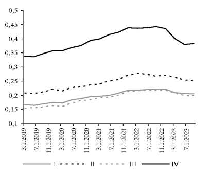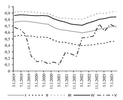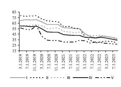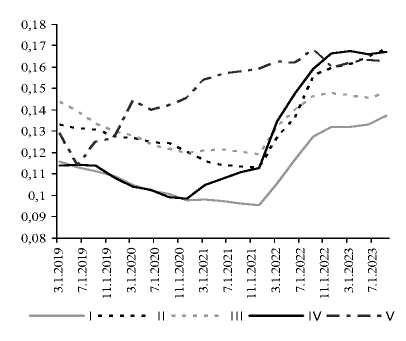 Рис. 12. Динамика медианы отношения займов к депозитам разных моделей американских бан-ков 2019–2023 гг.
