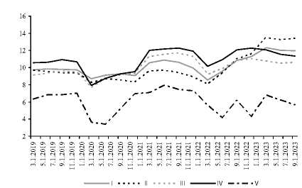 Рис. 13. Динамика медианы отношения ценных бумаг к активам разных моделей американских банков 2019–2023 гг.