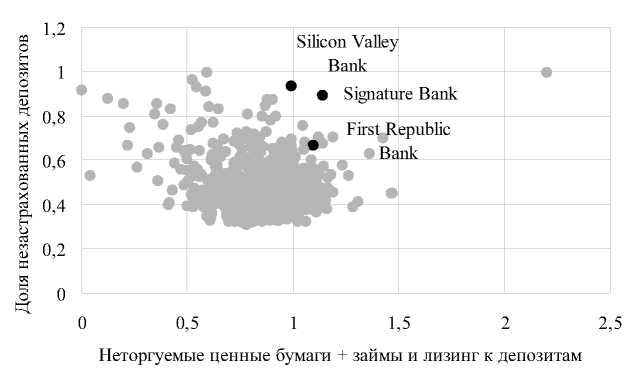 Другой особенностью бизнес-модели рухнувших банков стала высокая доля незастрахованных FDIC депозитов. Незастрахованными были 93,8% депозитов у Silicon Valley Bank, 89,3% у Signature Bank, 67,4% у First Republic Bank. Одна из важных причин этому – большой средний размер вклада, превышающий страховую сумму FDIC – существенная часть вкладов в этих банках была сделана небольшим количество корпоративных клиентов. Именно эта особенность структуры депозитов – относительно малое количество крупных депозитов – и увеличило вероятность банковской паники [Van Vo, Le, 2023].