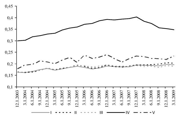 Примечание: в рис. 12–16 классическая модель (I), классическая модель с акцентом на инвестиции (II), классическая модель с акцентом на займы (III), классическая модель с акцентом на займы и высокой долей незастрахованных депозитов (IV), торговая модель (V).