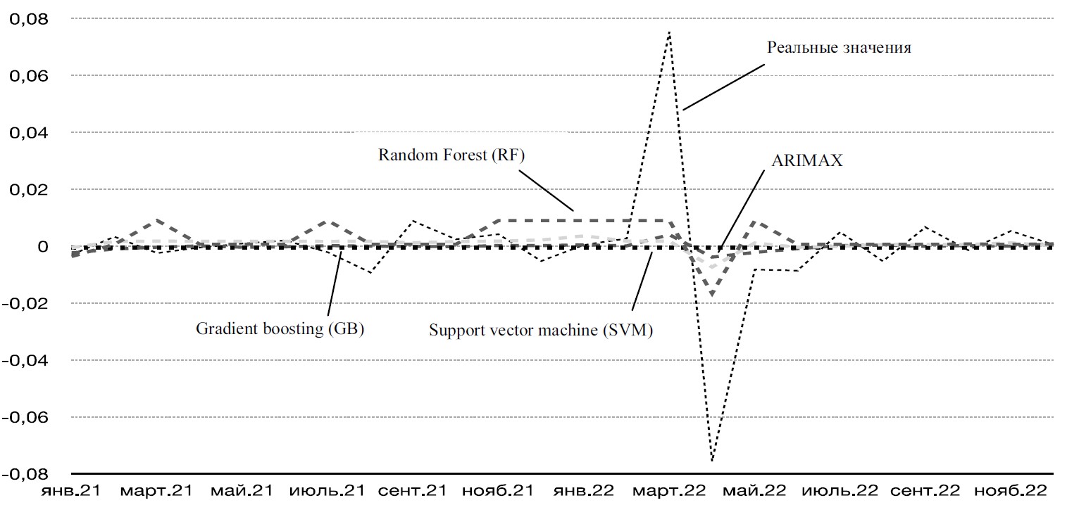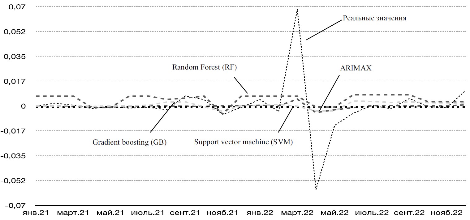 [3] Отметим, что ни для одного из 14 регионов ПФО не удалось ни одной моделью спрогнозировать пиковые значения инфляции за рассматриваемый период.