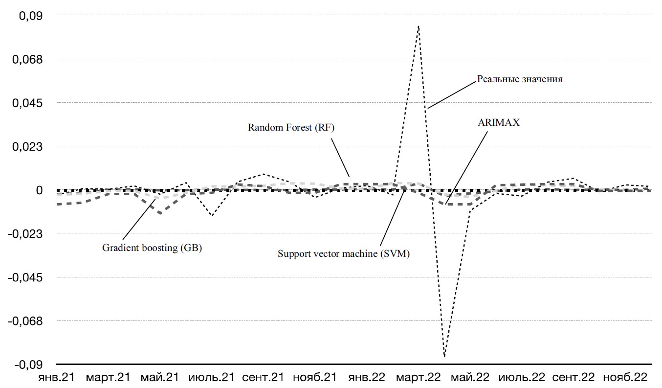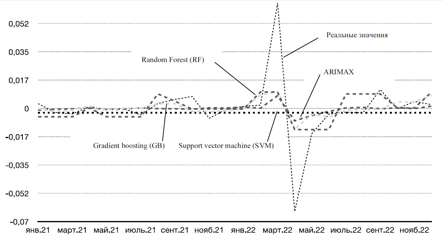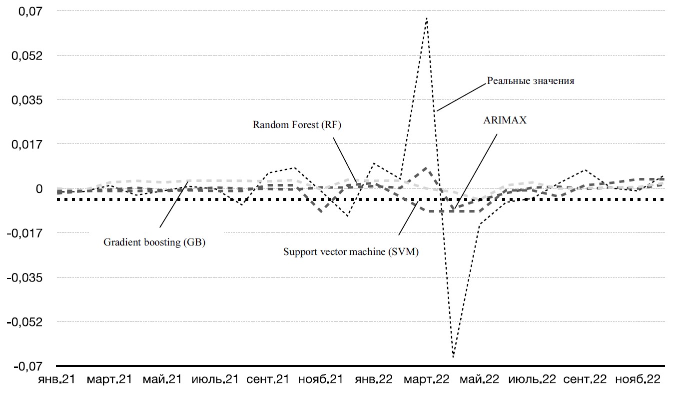 Бенчмарк (базовая модель) в работе – модель авторегрессии первого порядка AR(1). В целях сравнения моделей машинного обучения и эконометрических моделей по каждой модели машинного обучения мы рассматриваем отношение RMSEmodel к RMSEAR. Если значение показателя меньше единицы, то прогноз по сравниваемой модели лучше бенчмарка, если больше единицы – хуже. В исследовании используется прямая модель авторегрессии, в которой прогноз строится сразу на момент времени (t + k). Количество лагов в модели (p) подбирается с помощью Байесовского информационного критерия (BIC). Следуя методологии в исследовании [Семитуркин, Шевелев, 2022], помимо AR(1) в работе мы рассматриваем модель ARIMAX – модификацию модели авторегрессии-скользящей средней с включением дополнительных факторов. Как и в работе Семитуркина и Шевелева, в качестве внешнего фактора мы используем курс доллара США. Количество лагов в модели (p, q) выбрано на основании значения критерия BIC. Поскольку прогнозирование осуществляется в режиме псевдореального времени, для прогноза подставляется фактическое значение курса доллара. Такой подход имеет определенные ограничения, наиболее важное из которых заключается в том, что при переходе к прогнозированию в режиме реального времени значения валютного курса на несколько периодов вперед не представляется спрогнозировать с достаточной точностью. Тем не менее модельная оценка валютного курса может быть еще более смещенной, что побудило авторов статьи остановиться на использовании реальных значений курса и прогнозировании в режиме псевдореального времени.