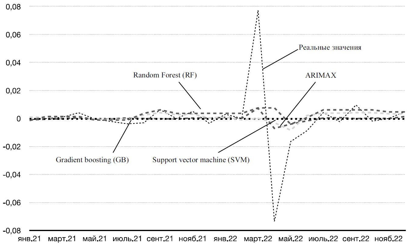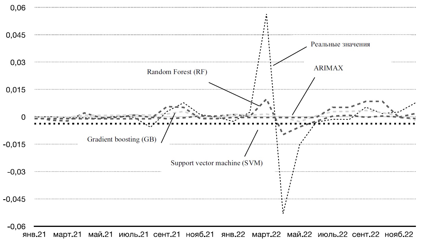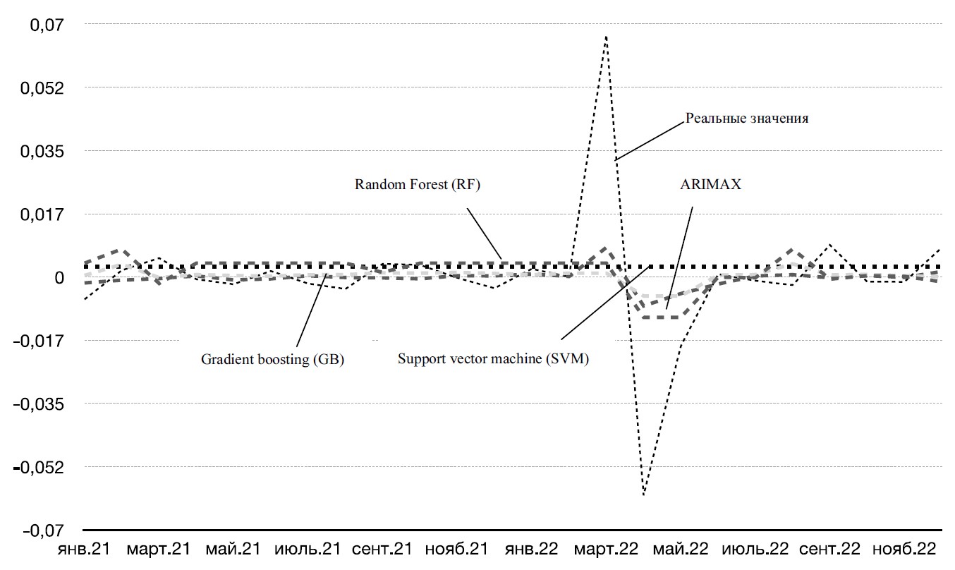 Бенчмарк (базовая модель) в работе – модель авторегрессии первого порядка AR(1). В целях сравнения моделей машинного обучения и эконометрических моделей по каждой модели машинного обучения мы рассматриваем отношение RMSEmodel к RMSEAR. Если значение показателя меньше единицы, то прогноз по сравниваемой модели лучше бенчмарка, если больше единицы – хуже. В исследовании используется прямая модель авторегрессии, в которой прогноз строится сразу на момент времени (t + k). Количество лагов в модели (p) подбирается с помощью Байесовского информационного критерия (BIC). Следуя методологии в исследовании [Семитуркин, Шевелев, 2022], помимо AR(1) в работе мы рассматриваем модель ARIMAX – модификацию модели авторегрессии-скользящей средней с включением дополнительных факторов. Как и в работе Семитуркина и Шевелева, в качестве внешнего фактора мы используем курс доллара США. Количество лагов в модели (p, q) выбрано на основании значения критерия BIC. Поскольку прогнозирование осуществляется в режиме псевдореального времени, для прогноза подставляется фактическое значение курса доллара. Такой подход имеет определенные ограничения, наиболее важное из которых заключается в том, что при переходе к прогнозированию в режиме реального времени значения валютного курса на несколько периодов вперед не представляется спрогнозировать с достаточной точностью. Тем не менее модельная оценка валютного курса может быть еще более смещенной, что побудило авторов статьи остановиться на использовании реальных значений курса и прогнозировании в режиме псевдореального времени.