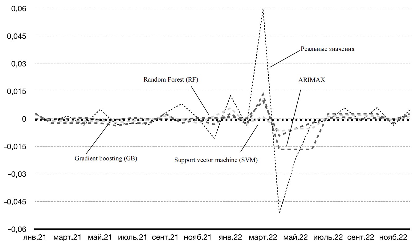 В работе на примере 14 субъектов Приволжского федерального округа анализируются региональные и внешние макроэкономические показатели – ИПЦ, уровень безработицы, курс доллара США, процентная ставка за период с января 2010 г. по декабрь 2022 г. Данные выгружены из Единой межведомственной информационно-статистической системы (ЕМИСС), использован R Studio для прогнозирования временных рядов, и Python для моделей машинного обучения (в частности, для метода опорных векторов, градиентного бустинга и случайного леса). Для оценки качества каждой модели мы использовали ошибку прогноза RMSE. Базовой моделью является модель авторегрессии первого порядка AR(1), которую мы использовали в качестве бенчмарка. Для сравнения моделей мы рассчитали отношение RMSE каждой модели к RMSE базовой модели. Если значение показателя получалось меньше единицы, то прогноз сравниваемой модели считался лучше бенчмарка, а если больше единицы, то хуже.