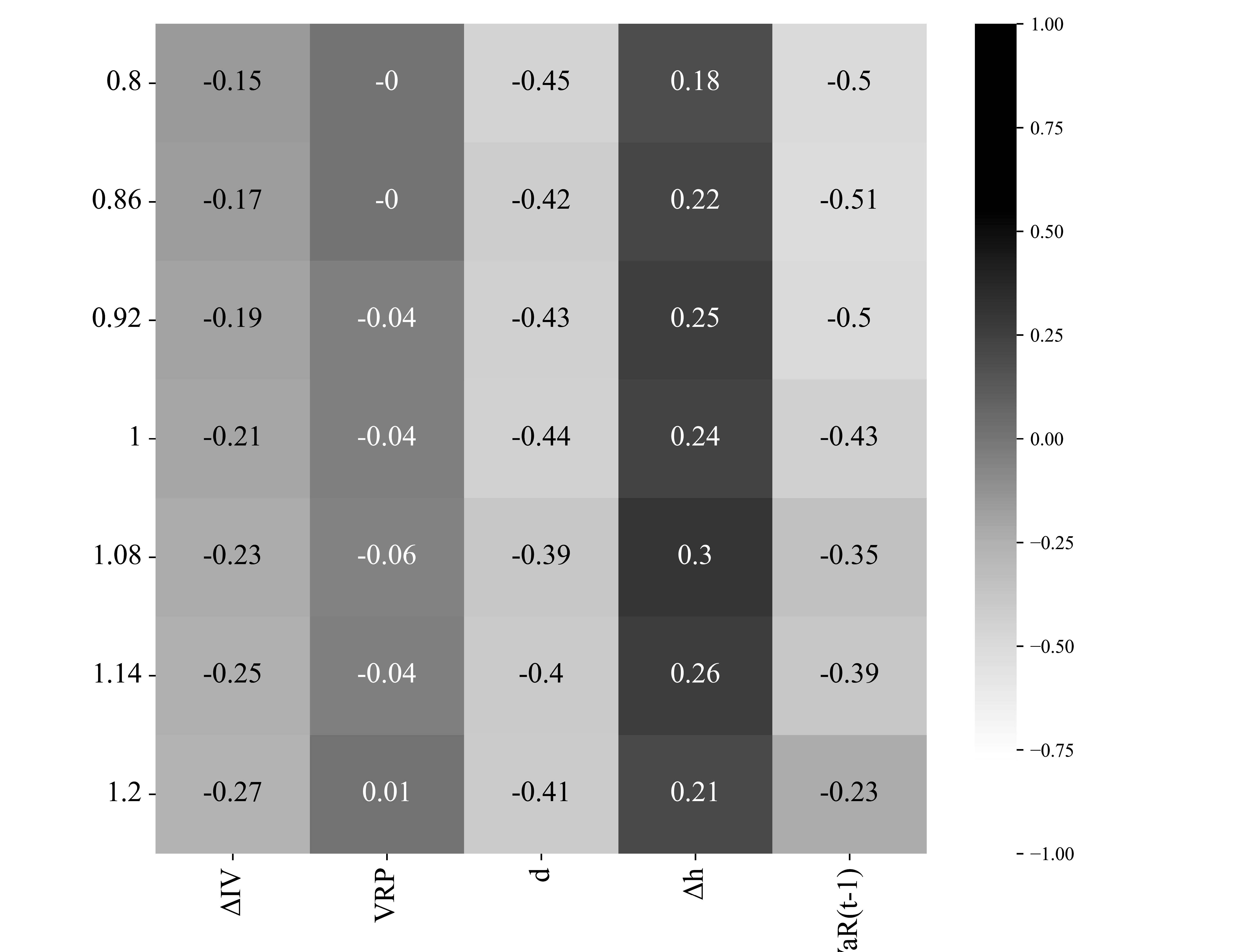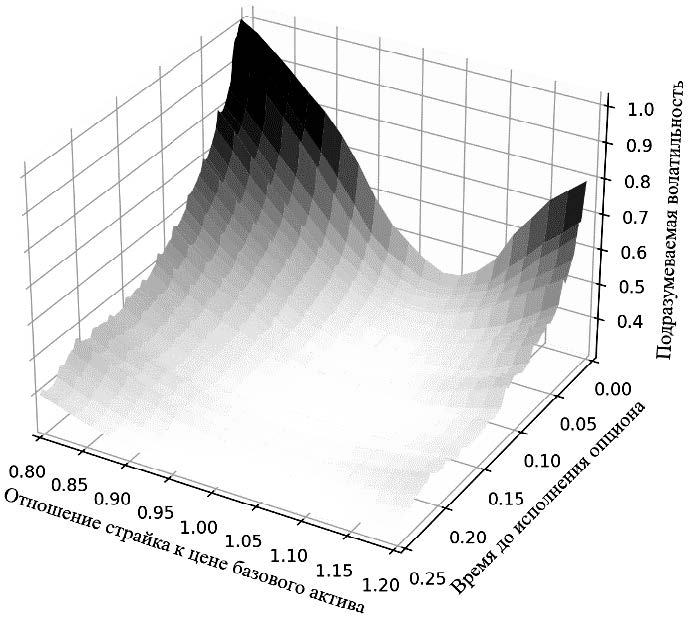 На рис. 1 отражена динамика подразумеваемой волатильности на различных уровнях moneyness (отношения страйка к цене базового актива) при изменении времени до исполнения (указано в долях от года) опциона. Как видно даже на усредненных данных, минимальное значение подразумеваемой волатильности смещено от центрального страйка, т.е., «ухмылка» волатильности является частым рыночным явлением и является своего рода предиктором растущего тренда цены базового актива, который подтверждается на исследуемом периоде наблюдений. Более того, если построить такой же график для дисперсии подразумеваемой волатильности, т.е. для каждой пары значений «время до исполнения опциона» и «отношение страйка к цене базового актива» вычислить дисперсию подразумеваемой волатильности по всем опционам на все базовые активы, то полученная фигура также будет иметь тренд на возрастание по мере приближения опционов к дате исполнения и смещение минимального значения с центрального страйка.