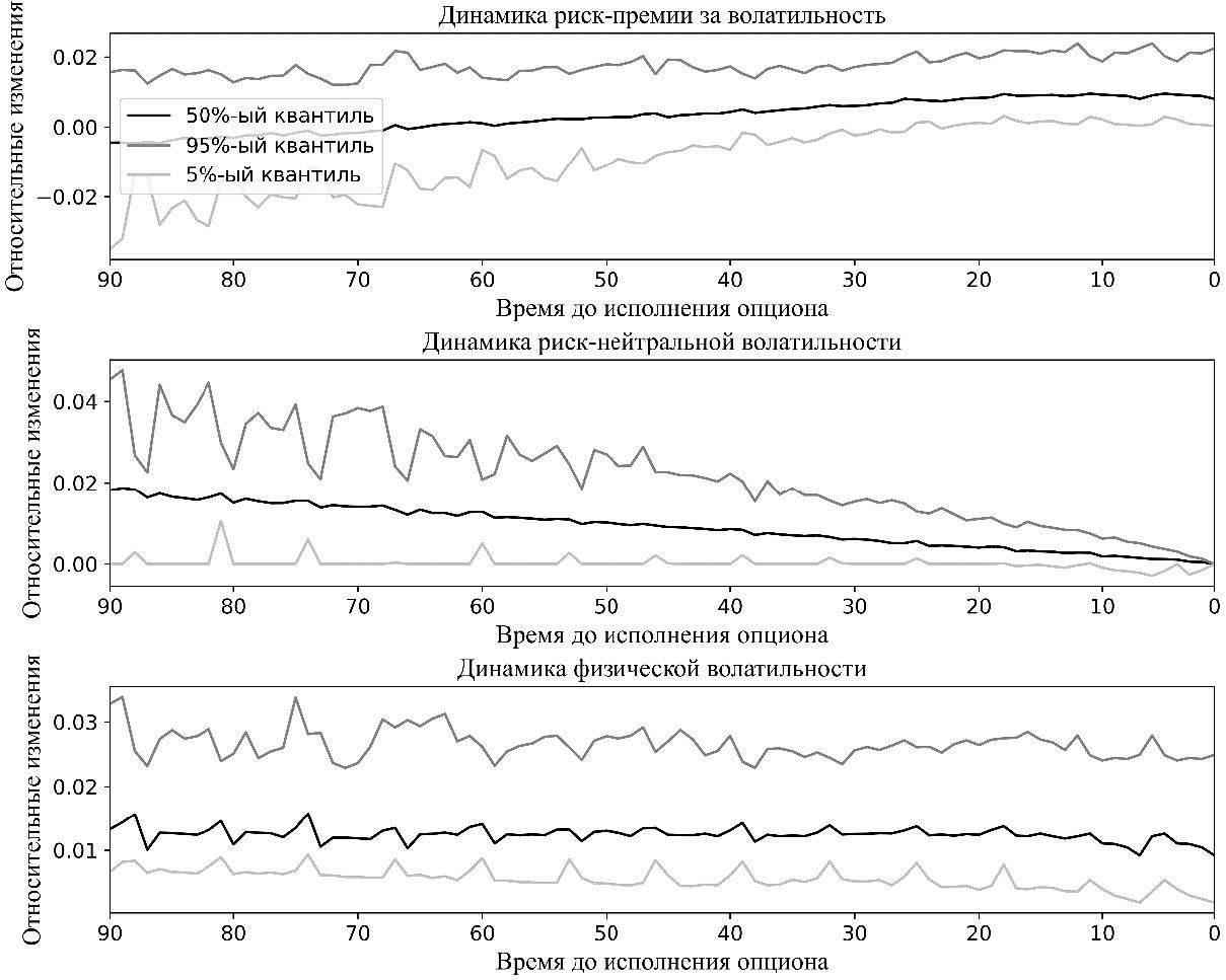 На рис. 2 отражена динамика риск-премии за волатильность, риск-нейтральной волатильности и физической волатильности с течением времени до исполнения опциона. Стоит отметить, что риск-премия за волатильность не является постоянной во времени за счет риск-нейтральной волатильности, а не волатильности базового актива. Так риск-нейтральная волатильность сходится к нулю с уменьшением срока до исполнения, а физическая волатильность является константой. Ввиду этого риск-премия становится положительной на малых сроках до исполнения, т.е., волатильность опциона в модели Блэка не соответствует фактической.