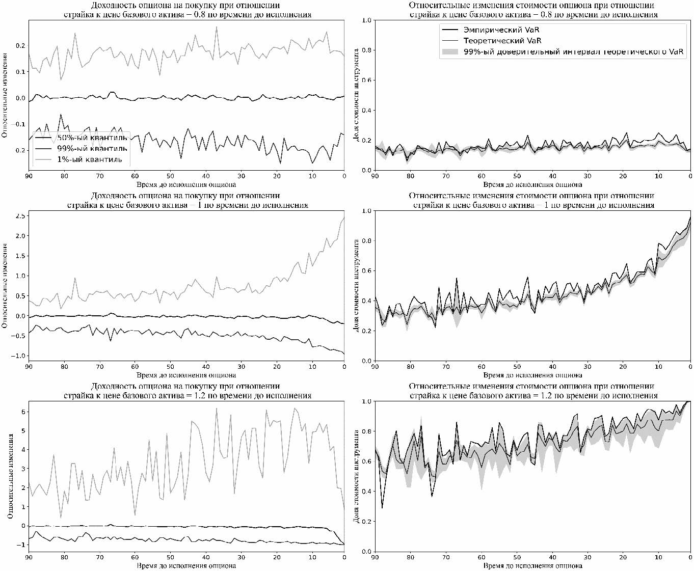 - наличия временной структуры самих риск-факторов – дисперсия изменений подразумеваемой волатильности возрастает по мере приближения к дате исполнения опциона и имеет тренд. То есть, если взять весь набор опционов и для каждого момента времени до исполнения при каждом соотношении страйка и стоимости базового актива посчитать приращения подразумеваемой волатильности и для этих приращений вычислить дисперсию, то эта дисперсия будет иметь тренд на возрастание по всему множеству соотношений страйка к стоимости базового актива по мере приближения опциона к дате исполнения. Таким образом, возрастает не только значение риск-факторов, но и их изменчивость.