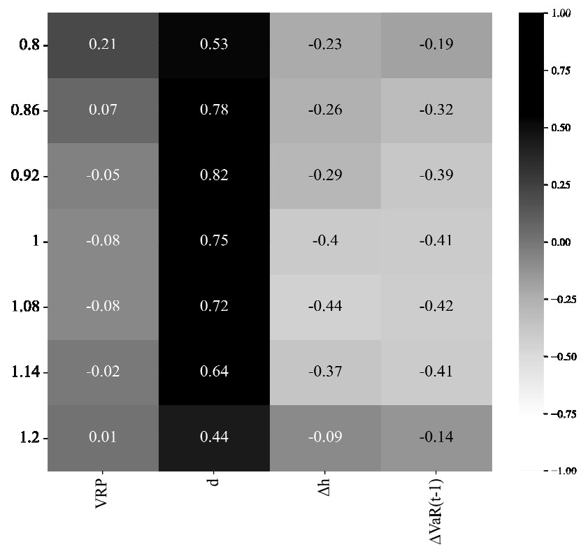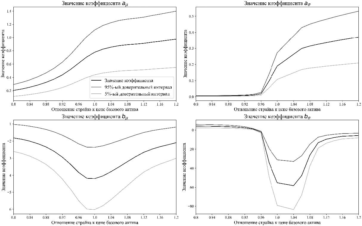 При рассмотрении модели, использующей структуру волатильности, на различных соотношениях страйка и стоимости базового актива стоит отметить, что влияние относительного смещения подразумеваемой волатильности является немонотонным. Так, коэффициент сначала растет до страйка, близкого к центральному, и потом снижается. Но в то же время коэффициент при смещении волатильности в страйках возрастает со снижением стоимости базового актива. Влияние предыдущего значения уровня риска при любой стоимости базового актива остается одинаковым.