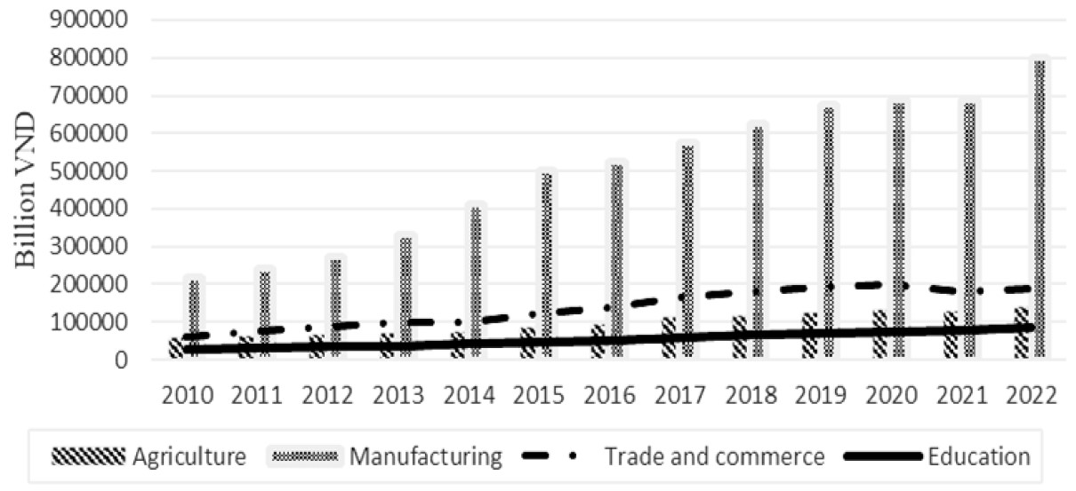 The Fig. 2 shows, the processing and manufacturing industry has consistently held the highest proportion of private investment in Vietnam in recent years. This sector's contribution typically exceeds 20% of the country's GDP and represents over 70% of the total import-export turnover during the period from 2018 to 2022. It encompasses various products such as crude oil, coal, and gemstones. Particularly noteworthy are high-value economic items like computers, electronic products, and components, which have seen a steady increase in export value, reaching $45.75 billion in 2022. These achievements are a result of improvements in the investment environment and intensified trade promotion, attracting major global technology companies such as Samsung, Apple, and Google to invest in Vietnam. Furthermore, there is an expanding wave of investment relocation, creating opportunities for Vietnam to attract an increasing number of large international investors.