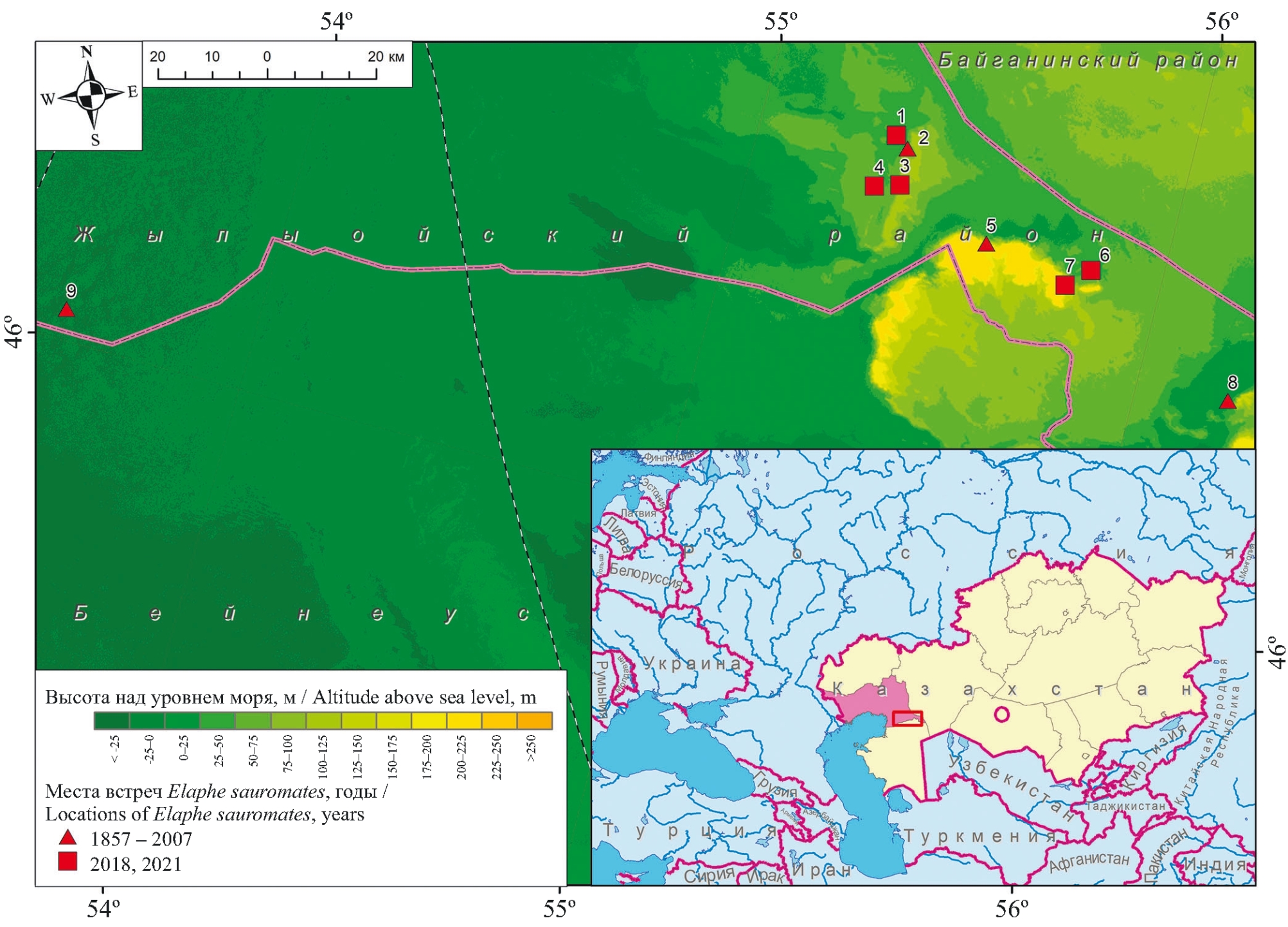 Места встреч Elaphe sauromates в Атырауской области: 1 – низменная равнина севернее гряды Шолькара (~ 46°40' N, 55°19'E), 2018 г. (Смелянский и др., 2018); 2 – горы Шолькара (~ 46°39′N, 55°21′E), 05.1967 г. (Неручев, Васильев, 1978); там же, 22.04.2006 г. (Сараев, Пестов, 2010); 3 – вершина горы в южной гряде Шолькара (46°35'26.2"N, 55°21'13.0"E), 02.05.2021 (наши данные); 4 – между южными грядами Шолькары (46°34'42.7"N, 55°17'48.9"E), 03.05.2021 г. (наши данные); 5 – «Джиль-тау» (~ 46°32'N, 55°35'E), 1857 г. (Никольский, 1905); «хребет Жельтау» (там же), 09–10.1977 г. и 07–08.1980 г. (Киреев, 1981); «горы Жильтау» (там же), 1973 – 1990 гг. (Накаренок, Неручев, 2001); 6 – подножие чинка северо-восточной оконечности плато Жельтау (~ 46°32' N, 55°50'E), 2018 г. (Смелянский и др., 2018); 7 – плато Жельтау (~ 46°30' N, 55°47'E), 2018 (Смелянский и др., 2018); 8 – чинк Донызтау, подножие горы Тамды (46°23′N, 56°13′E), 18.09.2007 г. (Сараев, Пестов, 2010); 9 – пески Прикаспийские Каракумы, пос. «Саркамыс» [Сарыкамыс] (~ 45°57′N; 53°35′E), 1986 – 1987 гг. (Панкратов, 1989)