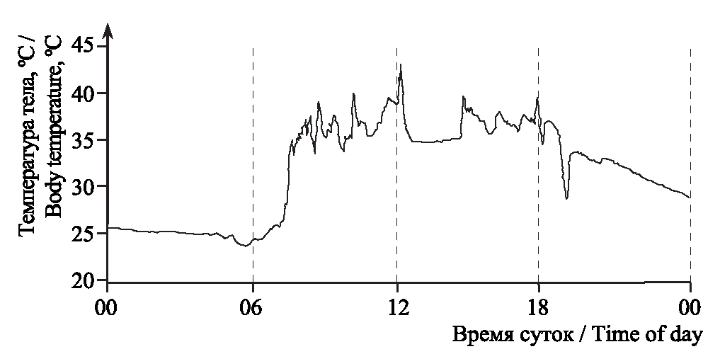 В результате применения новой технологии были получены данные о реальном суточном ходе температур тела ушастых круглоголовок (рис. 2). При этом характеристики активности, полученные с помощью прежней методики, вполне проявляются и по данным логгеров.