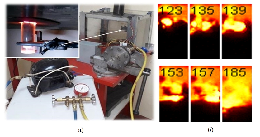 Рисунок 1 – а) экспериментальный стенд; б) кадры процесса синтеза