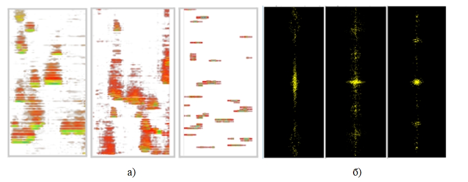 Рисунок 2 – а) интегральная картина очагов в волне синтеза; б) БПФ интегральной картины пространственного распределения высокотемпературной фазы синтеза