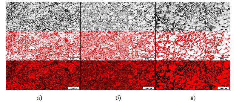Рисунок 3 – Микроструктура образцов, синтезированных в кварцевом реакторе с разной процентной добавкой MoO3 (10 %, 15 %, 20 %): а) оригинал; б) выделенная темная фаза; в) выделенная светлая фаза
