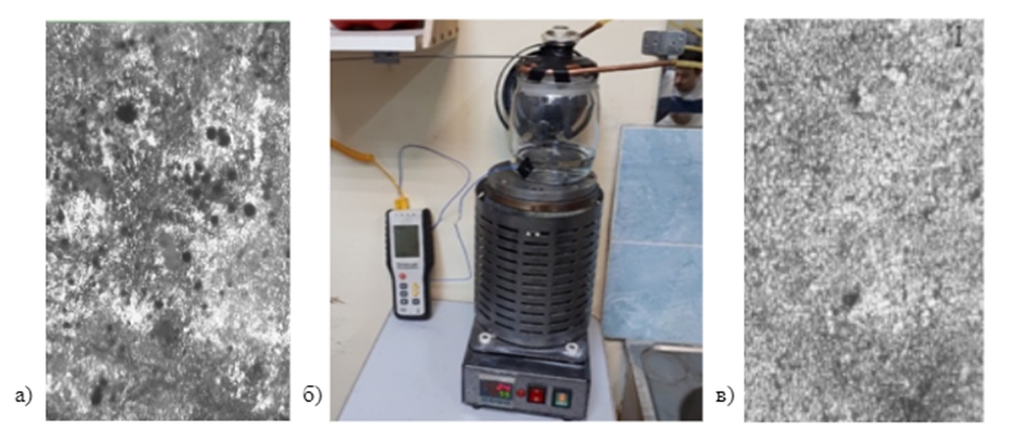 Рисунок 5 – Образец Fe2O3-Al+15 мас.% МоO3: а) фотография поверхности образца после испытаний 65%-ной азотной кислотой; б) установка для испытаний материалов на коррозионную стойкость;в) фотография поверхности образца после испытаний технической солью