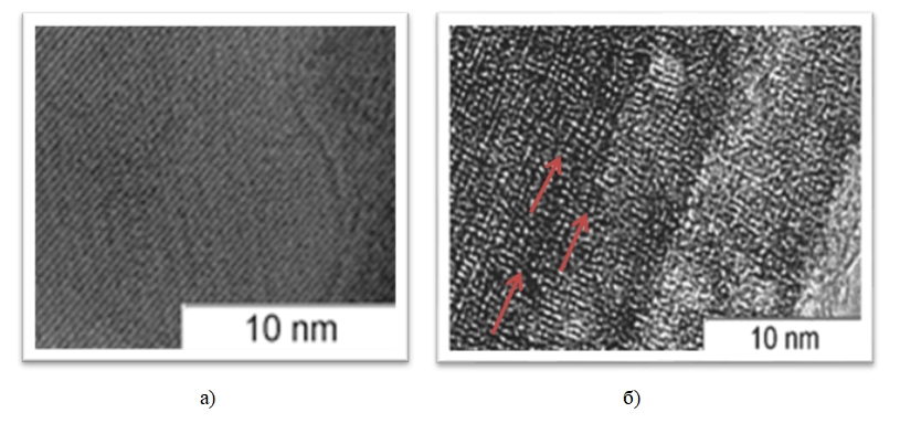 Изображение, полученное для мелкодисперсных частиц оксидной бронзы, показывает периодичность структуры образца. На ПЭМ-изображении нанокристаллических образцов можно увидеть появление большого числа дефектов – краевой дислокации (показаны стрелкой). Краевая дислокация является локализованным искажением кристаллической решетки, которое обусловлено наличием или отсутствием лишней полуплоскости.