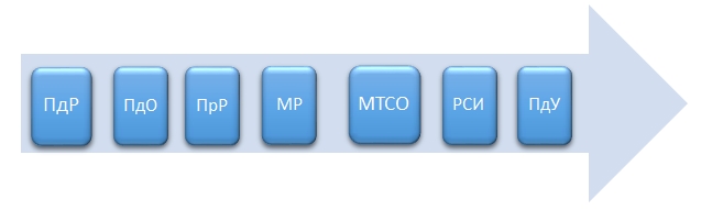 Рисунок 1 – Этапы охранной деятельности. ПдР – преддоговорная работа; ПдО – преддоговорное обследование; ПрР – выполнение проектировочных работ; МР – выполнение монтажных работ;МТСО – мониторинг состояния технических средств охраны (ТСО); РСИ – реагирование на сигнальную информацию от ТСО; ПдУ – предоставление сопутствующих услуг