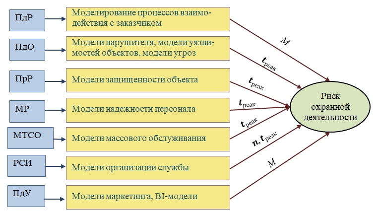 На рисунке 2 представлены наиболее широко распространенные модели отдельных процессов и показатели, учитываемые в этих моделях, применение которых позволит оптимизировать риск охранной деятельности, являющийся составляющим компонентом целевой функции.