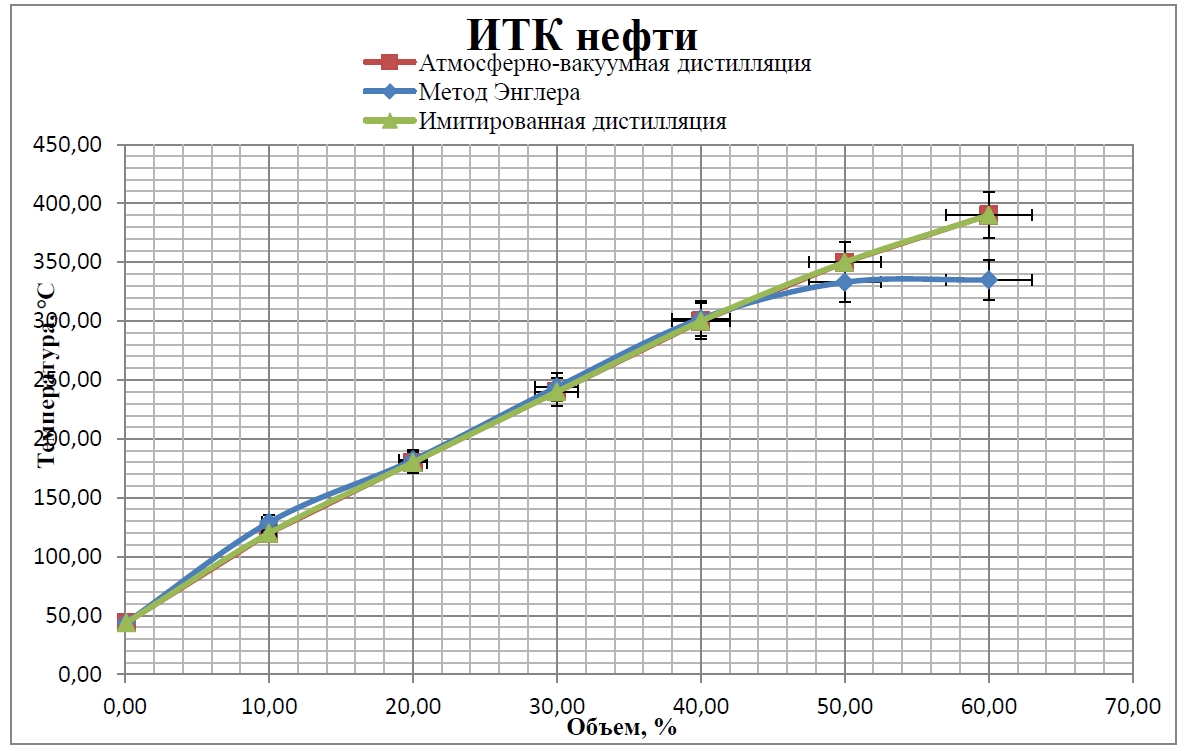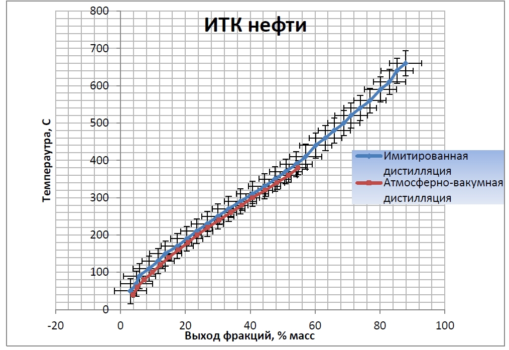 Сопоставление кривых ИТК нефти, полученных путем атмосферно-вакуумной ректификации и имитированной дистилляции (рис. 1), демонстрирует отсутствие статистически значимых различий.