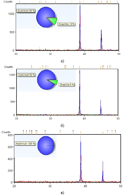 Рисунок 8 – Рентгенофазовый анализ АМг2-TiC: а) зона сварного шва; б) зона термического влияния; в) зона основного металла