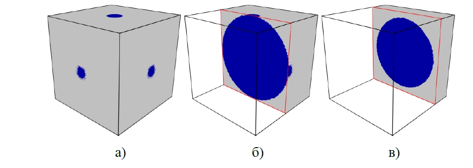 Результаты визуализации, полученные программой OVITO, отображены на рисунке 8 (фрагменты а и б). В центре фрагментов 8а и 8б отчетливо выделяется Ti-ядро. Геометрические формы и размеры Ti-ядра на всех фрагментах (а, б, в) практически совпадают и подобно расположены. Распределение интерметаллических фаз с номерами 3, 4, 5, 6 в виде сферических слоев (либо других структур) по фрагментам (а, б) рисунка 8 практически установить невозможно. Применяя предложенный метод 3D-распознавания интерметаллических фаз [12, 13, 14], на фрагменте 8в отчетливо распознаются сферические прослойки фаз 3, 4, 5, 6 (фаза 6 особенно выделяется). Поэтому пакет OVITO со встроенным Ackland-Jones анализом (другими словами, Bond-angle analysis – анализ по углу и длине связи) имеет ограничения по распознаванию интерметаллидов в структурах «ядро-оболочка».