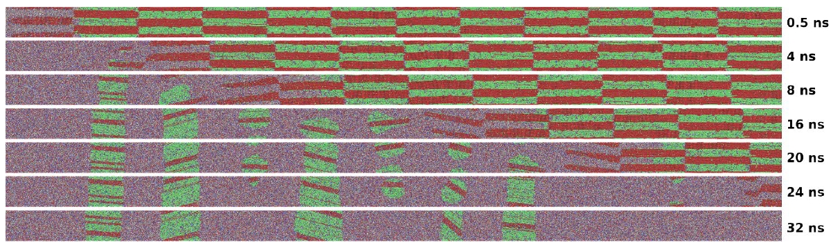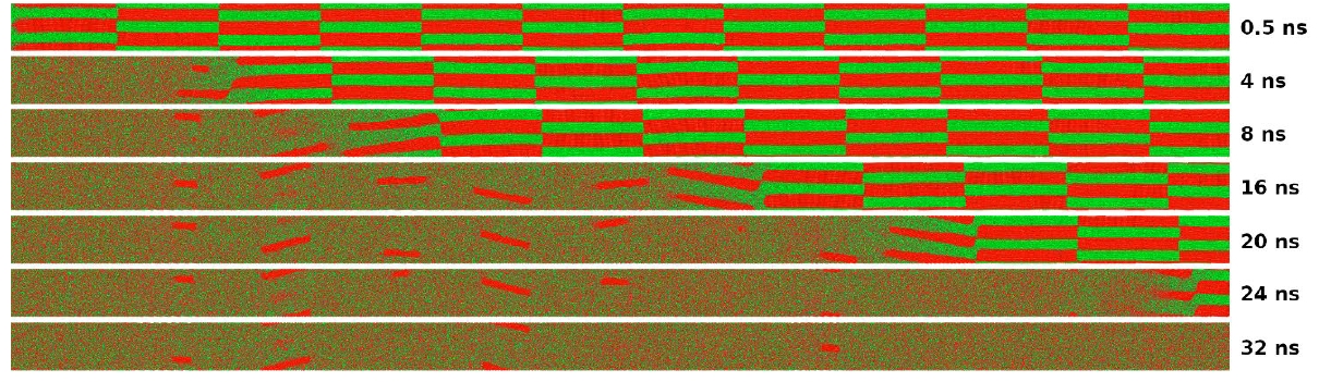 Используя функциональные возможности пакета OVITO, можно анализировать во времени процессы диффузии, растворения и движения фронта волны горения СВС, например, как показано на рисунке 4 для слоисто-блочной структуры (СБС) наносистемы Ti-Al в центральном вертикальном сечении (в плоскости XZ с координатой Y=1.25 нм).
